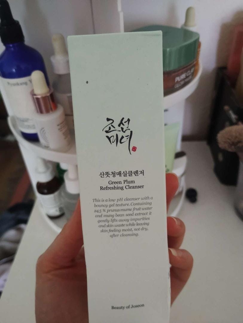 It's a mild, pH-balanced gel cleanser formulated with 24% green plum water and mung bean seed extract to gently cleanse the skin without disrupting its natural moisture barrier.